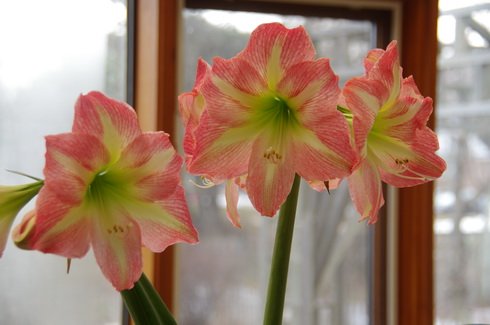 How dull the kitchen would be in the middle of winter if it were not for Amaryllis. This is just the first of the old bulbs that were having a rest in the cool dark basement. There are a few more waiting for their turn to come up into the light. I try to bring up a couple of them every two weeks so that the kitchen will have those great blooms until spring. They stay in their pots while they are resting and that gets them very dry. The first step is to stand them in the laundry tub with a several cm of water so that they soak it all up from the bottom and get thoroughly wet. When the blooms are finished they will find a spot on the floor of the solarium so that they can keep growing leaves until it’s time to put them outside for the summer. The big Cactus in the corner is starting to display its large yellow blooms. I’ll show you some pictures in the next edition.