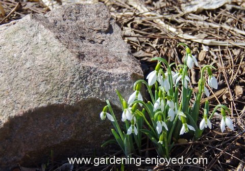 These Snowdrops are really quite amazing. We have seen them several times over the last month or so as the snow receded and then accumulated again. The picture includes the big brown rock, as it is the key to very early blooms. It appears out of the snow first and its dark colour draws the heat from the sun and that helps to warm the adjacent soil giving those close bulbs the encouragement to throw up some of their delightful harbingers of spring. The same Snowdrops in the front yard probably won’t venture forth, for at least a couple more weeks. The beauty of Snowdrops is their early arrival. If those tiny 3 cm flowers were in the middle of the summer garden they wouldn’t even be noticeable but this week they are the biggest and showiest thing in the whole garden.