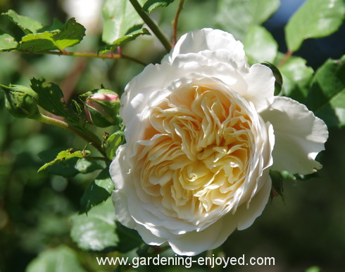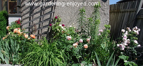 Several of my Roses are planted in a little raised bed behind the garage/garden shed. I prefer to think of them as a treasure waiting to be discovered rather then hiding behind the garage. They share this space with a few Daylilies, Narcissus, Lilies and a couple of Zucchini. Just one of my “well planned” gardens. Those Roses have all been spectacular this spring and at least two weeks early. The four David Austin’s along the wall were transplanted from another location in the garden and have happily survived the move and adjusted well to their new location. I had always wondered about moving an established Rose.