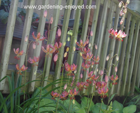 These delightful little flowers are Martagon Lilies. I love them because they are always the first Lilies to bloom and they are happy in a reasonable amount of shade.