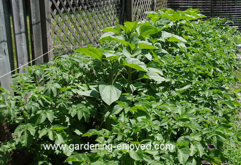 This appears to be a highly successful experiment. Those are Sunflowers planted between two rows of Potatoes. The idea was the sunflowers would grow fast and tall enough to tower over the Potato foliage and brighten up that section of the garden. The Potatoes are giving them a run for their money this year and if the size and speed of the foliage is any indication we should have a great crop and soon. The Sunflowers will be wonderful bonus.