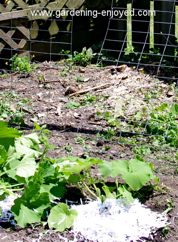 I used to have an orange fruited Lilac, which many of you may have seen in my Vertical Vegetables presentation. I had for many years guided my winter Squash vines up into the old Lilac bush in the corner of the vegetable garden. That Lilac’s time had expired and it made some trips to the fireplace and the compost. We still needed to grow those squash in that limited space so this 2" x 4" welded wire fence was suspended from the backyard fence and the Squash were advised of the desired direction to grow and they have quickly responded. Now hopefully the new structure will be sturdy enough to hold, if we get a bumper crop of Squash. The white around the base of the Squash is the shredded paper from the office. We pack it around the base of the stem in an attempt to stop the squash vine borer from laying her eggs into the base of those stems. Seems to work reasonably well and by next spring the paper mulch is just part of the soil.