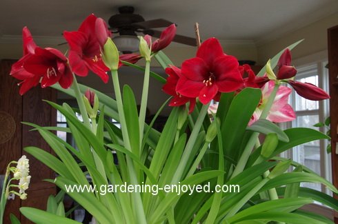 This big red Amaryllis has been with us for a few years and last summer we repotted it, removing a few of the small outer bulbs, and putting the big central bunch back into the same pot. When all the blooms are open there will be about 35-40 of them and it is quite spectacular. If you acquired a new Amaryllis bulb this winter keep it growing and move it outside in full sun, in the summer, and water and fertilize it regularly. It will replenish that bulb and probably start to grow offsets that will be big enough to bloom in a couple of years. Into the cool dark basement before the first frost and let it dry out and go dormant until early next year then return it to the light, water and warmth and it will reward you for your efforts.