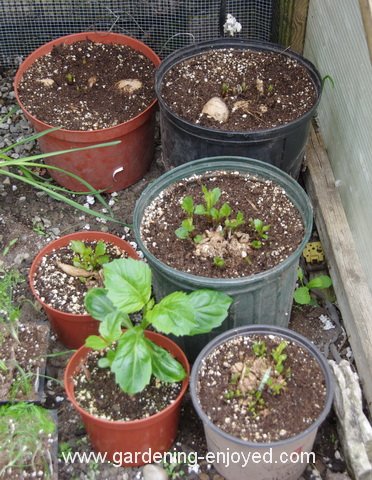 Dahlia tubers are always the deadest looking things when you buy them or bring them out from their winter storage. They are all brown and wrinkled with nary a hint of anything green showing up. The only hope is that those few, big, fat tubers, which apparently are edible although I have never tried them, will wake up and feed the very dormant growing point. They invariably do when I pot them up in late March. Here they are starting to grow nicely and the different varieties seem to wake up at different times. I just happened to walk by the rack of new Dahlias at the garden centre earlier this spring and a couple of them just seemed to jump into my cart. Those are the small containers in the picture. Happily they are both growing.