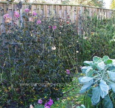 A big dig is waiting for me. The Dahlias are finished providing us with their wonderful harvest of cut flowers. They are particularly sensitive to the lightest frost and they let me know by turning this rich black colour. You will notice the very happy Brussels Sprouts in the foreground. The Dahlia tubers are just fine buried in the still warm soil. I have started cutting off the tops an adding them to the compost. The tubers will be carefully dug up and dried so that all of the soil can be removed. They will then be settled into their bed of shredded paper to spend the winter in a cool section of the basement. As I dig them I marvel at how big some of those tubers have grown and then I start to wonder how big the pots will have to be to get them started next spring. Even great garden successes present problems. The large cardboard box they were stored in last winter is obviously not going to be big enough this year. I did have a few duplicates this summer. Can I make