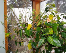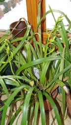 There are some good things happening as well. The Phalenopsis Orchid has five new blooms on an old bloom stalk and a whole new stalk is developing well. The patterns on these ‘moth orchid’ flowers are quite amazing. Lots of dots and streaks of vibrant colours. They are readily available in garden centres and flower departments. Buy one and enjoy the flowers for several months. Just look for a plant that has a flower stalk with a few opened and several unopened flowers and you will easily get your money’s worth. Getting them to rebloom another year is quite easy and the plants are relatively small, usually 3 -4 leathery leaves in a 15cm pot, for the flower power that they provide. They will need a fairly bright window to make them flourish but it’s amazing how long they will continue to bloom in even a normally lit room. On the floor of the solarium are the much less elegant pots of Cymbidium Orchids. Long rather beat up looking grass like foliage that has little to recommend it except for the multiple bloom stalks that are rapidly reaching above this foliage. In another few weeks they will open into these gorgeous Orchids and the plainness of the foliage will go unnoticed.