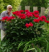 In between the Iris I do allow a few Peonies to grow and they have also been wonderful this year. A few of them opened during the very warm days that we had earlier, (not enough to dry the garden,) and seemed to last a very short time. My favourite Peony is a large single red variety, “America”. The plant in the picture has about 45 blooms on it and was planted at the front of the garden in 2003. It stops traffic on the road.