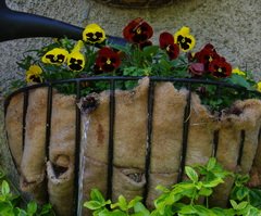 It is my firm belief that the many hours I spend in the garden growing gorgeous flowers and delicious vegetables make Mother Nature look even more wonderful. Why then does she find new ways to test and torment me. Ignore the fact that this issue of Dallying In The Dirt is late because I am scrambling to get the last of the garden planted now that we finally have a few days of warmth and sunshine after the great deluge of 2011. The wall planters have been growing great Pansies in the cool wet weather but they still need watering because the rain does not reach them. Watering the largest of them last week became a very irritating experience. The minute I started to pour water in, it started to pour out the front of the container. Somebody, I suspect the bushy tailed tree rats (aka. squirrels,) had taken great chunks of the coconut fibre liner to make their nest cozy. The result was no freeboard to hold the water. The liner was chewed down to the top of the soil and any added water just ran right off and down onto me. New on the job list. Cut some strips of coco liner and tuck it into the top of the planters so that they can be watered. Gardening is always an interesting challenge.
