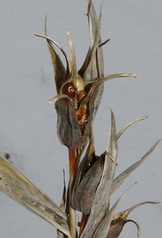 Ken answers! I haven’t a clue, was my answer when I was shown the seed pods. Today, a lucky coincidence, when I was wandering around the snow drifts looking for spring I happened to notice these woody recurved seed pods on top of the 150cm /5ft flower stalks of my Spuria Iris. Seed that was collected last fall will probably need a cold period to germinate. I’m just going to collect and plant a few of mine, that were outside all winter, and see what happens. It’s probably 2 -3 years to a blooming plant. I love it when a happenstance find in the garden makes me look knowledgeable!