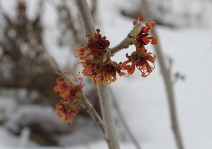 My Witch Hazel, Hamamelis intermedia ‘Diane’ continues to expand her flowers. I freely admit that you have to put your boots on and go and have a close look but isn’t that what we do everyday in the summer in order to appreciate what’s in the garden. The same tour of the garden this morning showed significant patches of bare soil where early vegetables might be able to find a home when some of the water leaves. The openings in the ponds are getting bigger and the Crocus, that evaded the squirrels, in the Hosta bed are showing leaves and coloured buds.