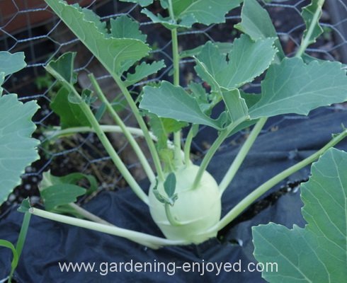 This delightful little Kohl Rabi will grace our dinner table tonight. It has been an uphill battle to produce these this year. They were one of the first things planted and were not protected from the rapacious rabbits until they were mowed down, letting me know, that even in the elevated Earthboxes they were not safe. You can see a bit of the chicken wire enclosures in the background. We have made a fitted enclosure for each of the boxes adding yet another chore in the ongoing battle to keep some of our vegetables for ourselves. They did regrow sufficient leaves to allow the delicious little bulb to develop at the base of the plant. Sliced and coated with a bit of breadcrumb and grated Parmesan they will spend a few minutes in the frying pan before pampering our palate.