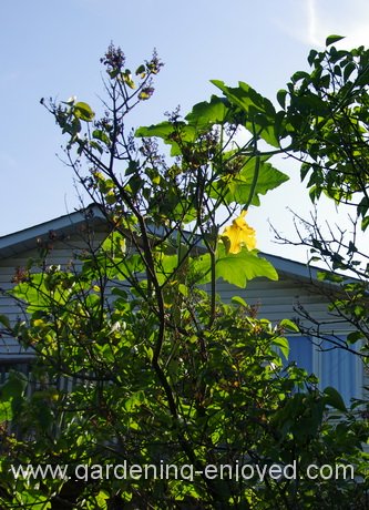 The tall Lilac in the very back corner of the garden is once again producing some weird blooms and fruit. I have regularly used it as a support to grow my winter squash in a more vertical fashion. This year I pointed one of my climbing Zucchini in its direction and it decided it really liked it there. Now you see a Lilac with a large yellow bloom in the last weeks of August. If you look closely through the branches you can make out a developing Zucchini. It’s about 1 m long and just right for picking and eating but I’m afraid I may have to get out the step ladder to undertake that chore. Maybe I should do that very early in the morning so that I don’t have to explain to the neighbours why I’m climbing the Lilac in August; although they just seem to accept strange goings on in my yard for whatever reason. Those long thin Zucchini trombata make a delicious contribution to the dinner plate.Now it’s time to answer a few of my reader’s questions. To ask a question just “reply” to this ezine. Don’t forget to check the front page of the Website for frequent short ideas for current gardening activities. Karen Asks? Was wondering if I should prune off the flowers off my tomatoes as I'm sure they will not come to anything substantial at this point. Also could you tell me if it's too early to put in my garlic for next year. I can't remember if I put it in last August or September. |