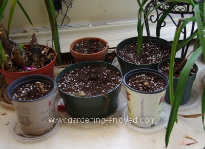 them! They will probably grow up out of the compost heap as a couple did last year. Despite my self restraint and lack of garden space, a few new Begonias and Dahlias seemed to have somehow found their way through the door and onto the potting bench. It’s amazing how that seems to happen. All of these pots need heat and water to get started but not any real light until the shoots appear. That’s why they are tucked in between the Orchids in the solarium as you can see in the picture. Only the Colocasia corms still need to be planted and that should happen this week. They present another dilemma. They multiply quite well over the summer and I have a large bucket of them to be planted. How many do I actually need or even want?? Since the corms are edible and are widely consumed in tropical countries maybe I should plant some and try eating the others.