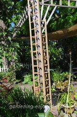 The corner posts that support the upper trellising around the deck all have Clematis growing up them. Last year I planted a new white Clematis in front of the one post that didn’t have any trellising up the actual post. That Clematis bloomed beautifully this year while running through the Siberian Iris that are planted by the pond. All of this leads to the need for a trellis at that corner. Now I can’t be satisfied with some purchased trellis that doesn’t really fit the spot or do the job. Late one afternoon when my back and knees no longer want to bend over and pull weeds, out comes the table saw and some 2"x6" cedar lumber and the creative carpenter starts on this little chore. All of the sawdust created by turning a plank into many small trellis bits, makes a wonderful mulch on one of the small beds. By 3:00 the next day, this “short” chore was finished and the Clematis has a lovely home of its own. I still have some cedar left, maybe I need to make another obelisk for the garden when I have a few minutes to spare and I want a break from the weeding.