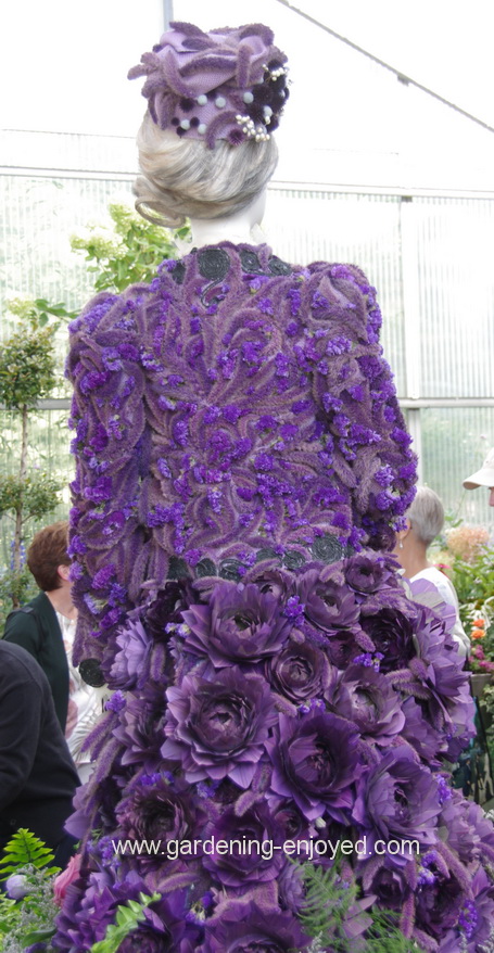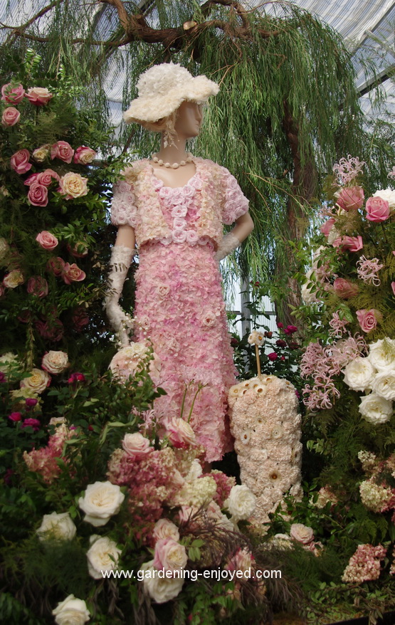 All in brilliant white was Lady Rose, where we saw one of the many interesting uses of floral material. The dress is mostly lace like and how did they create that. We are all familiar with how a Japanese Beetle will skeletonize our leaves, well, you can create a lacelike material by deliberately skeletonizing dozens of leaves and then colouring them white or whatever colour you desire.