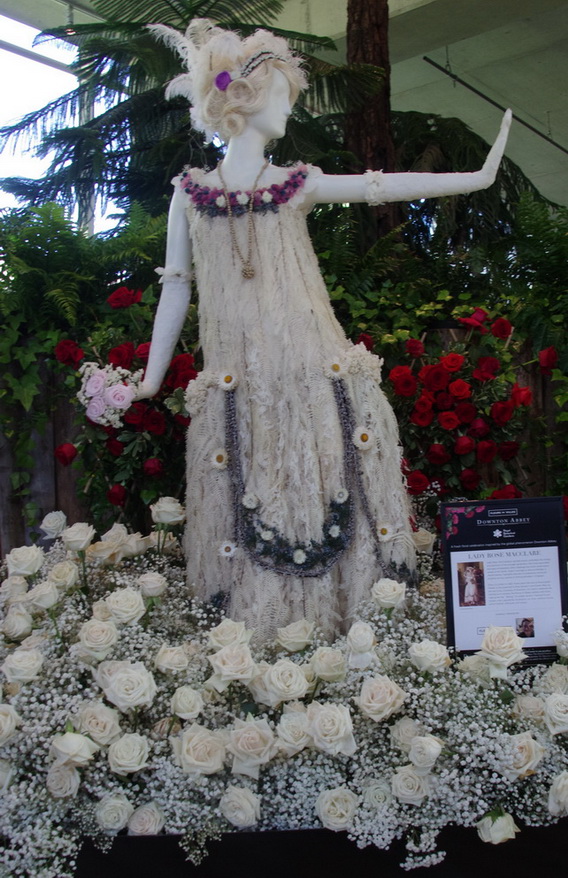 One of my favourite characters from the show was the dowager countess as portrayed by Maggie Smith and she appeared just as formidable in floral dress. I actually appreciated the back view more and, yes, all of the characters were dressed in 360 degrees. The large Dahlia like flowers in this dress are actually hand made flowers using the varying sized petals of other flowers. Just one of many examples of the hour’s long effort required to create this amazing display.