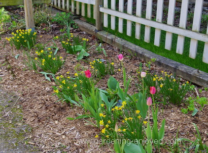 Here’s the promised pretty picture. Those are Tete a Tete, miniature Narcissus, growing happily in one of my new shrub beds. They seem to be in discrete clumps and they are. These are the bulbs that I force inside each winter. After they have brightened our dark February days they are allowed to grow and regenerate the bulbs and then I plant them outside in the spring. Each little clump that you see is the result of planting the whole pot full of bulbs. I’m too lazy a gardener to actually separate the bulbs and they create this wonderful effect the next spring. They often don’t perform too well the first year outside but they are very hardy little bulbs and they provide this great display for many years to come.