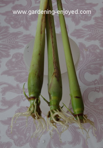 I went to the Asian grocery store a couple of weeks ago and carefully selected three stalks of Lemongrass. They had to have solid bottoms with some exposed stem showing a couple of nodes. Once they were selected they went home and into a glass of water. As you can see they are now rooting very nicely and some lateral shoots are already developing. These went downstairs and were potted up, all three in one big pot, and placed under the lights. It is possible to grow Lemongrass from seed but it is a very slow process and being tropical it cannot go into the garden until well after the last frost. By starting with these sturdy stalks I can much more quickly grow a large clump in my garden before first frost in the autumn. This wonderfully flavoured herb features in many oriental recipes and my favourite is putting a stalk or three in a pan with some white wine and using that to poach Arctic Char or Rainbow