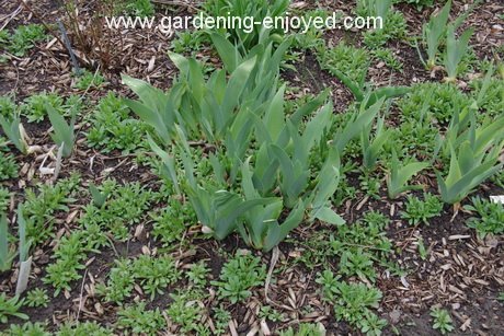 How could I forget these healthy clumps of green thriving between the Iris. They are of course, Forget Me Nots, an annual flower that is actually grown intentionally by many. It is also a heavily self seeding plant that some of us see as a very prevalent weed. One gardener’s treasure if often another gardener’s curse. They do have lovely little blue flowers that unfortunately rapidly develop into seed pods. Another example of Mother Nature providing us with crops that thrive in our cool spring days whether we want them to or not.