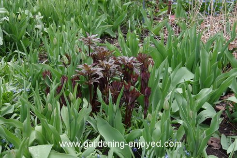 This is a much happier scene with the advancing red stems of an early Peony happily commingling with a mass of Tulips that are about to burst into bloom. They will eventually fade and leave the space to Pink Angel, that lovely single Peony that is one of the first of the large Peonies to bloom. This constantly changing and evolving display of blooms is the big reason to have a mixed perennial bed.