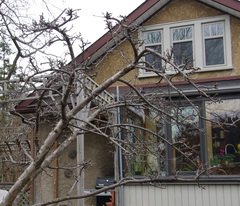 Just before it manages to break out into blossom and its green leafy splendour, I managed to prune my Crab Apple tree this past week. I could have ventured out and done this anytime during the winter but there was always next week. This tree is in the centre of my three ponds and I prune it severely to retain a reduced size and interesting shape. I don’t want too much shade over the ponds and I want that whole area to have a distinctive appearance. Almost all of the new growth is removed each year. Luckily apple trees bloom on old wood spurs and not on the lanky new growth. This particular variety blooms every other year. That’s not so great in the spring but it is much better in the autumn when I don’t have to contend with a pile of small crab apples that fall into the ponds and make them look like large apple bobbing venues for a children’s party.