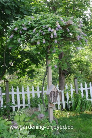 This Wisteria tree has only taken me about 17 years to perfect. Wisteria, as we know, is a large woody vine but having no structure to grow it on I decided, in 2007, to create a “tree.” That’s a 3 m 4x4 with a cross of 2.4 m 4x4's on top and some plastic clothesline joining them together to make an invisible platform for the Wisteria to lay its tendrils on, giving it a tree like appearance. Several years of pruning and guiding finally got it to the top with no branches on the way up. After installing the clothesline platform, pruning was continued for a few years to get all of the platform covered and this is a picture of all that effort. 17 years of pruning and training to get about two weeks of cascading bloom from the 2.4 m top of that “tree”. You don’t have to be a bit crazy to be a gardener but it helps.