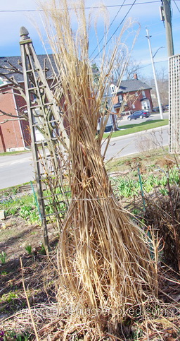 If you have always hated cleaning up some of our larger decorative grasses, here’s a tip. Tie the dead grass into a firm bundle while it is still standing and then cut at the ground level and see how easy it is to carry away the bundle of dead grass. If you do it carefully there should be minimal clean up as all of the grass stalks should be firmly in the bundle. I make a loop in one end of the string wrap it around the grass and then insert the other end through the loop making it easy to pull tight and then knot it to keep it on place. If the grass is very long then tie it in a couple of places so that you can cut it into shorter bundles when it is loose from the ground.