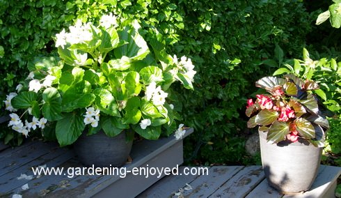 Begonias are wonderful annuals. They will thrive in the sun or shade and flower continuously until the frost finishes them. These are two of the newer types that grow to a significant size. I started them from seed in first week of January and they wandered along for months and when they got released to those large containers they just took off. The white flowered one is called, strangely, Big White and the other one had a better naming team as it is Red on Chocolate. It’s fascinating that such big plants grow from some of the world’s smallest seed. I was not very successful as these four plant are all I managed to raise from twenty seeds. Like all situations, I think I learned a bit and will find out if that is true when I try them again next year. There really is just a single plant in each of those containers and they are already about 50 cm tall and equally as wide. A great replacement for the Geraniums I used to grow on those front steps. I bought my