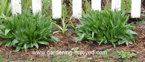 Against the west fence these big clumps of rich green leaves are growing prolifically and we cherish and encourage them because they are the spring foliage that produces the wonderful autumn Colchicum blooms. Each of those clumps now puts out 15-20 of those big, light, purple blooms in late September. This foliage will disappear by mid summer leaving the clumps of tall perennial grass growing between their spots.