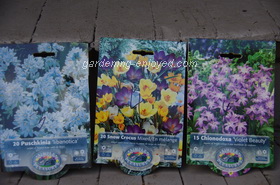 I can’t let an autumn copy of “Dallying” go by without again mentioning Bulbs. Spring, mostly, flowering bulbs are another of my garden favourites. Today we are looking at the minor bulbs. They are minor in size only. They are the first things to bloom in the spring and those first bursts of colour are anything but minor to a winter weary gardener. They start with Snowdrops and move on through the several types of Crocus, the bulbous Iris, the upright Puschkinia, then the beautiful swaths of spreading Scilla and Chionodoxa, usually finishing with the Muscari. These tiny delights have other virtues. The bulbs are small and easy to plant and many of them are quite inexpensive. Rush out and plant some now.