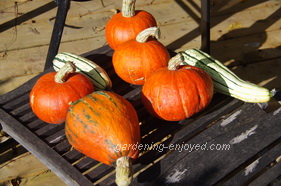 A much more pleasant chore was wandering around the vegetable garden picking up all of the winter squash that I found. Their vines have completely died down and are on their way to the compost. The delightful bright coloured squash have moved to a sunny spot on the deck where they can ripen and mature before they head downstairs to the cold room. I grow mostly Buttercup types because we enjoy their dark, richly flavoured taste. Baked and served with some butter and Maple Syrup it is a wonderful winter taste treat. They will keep in the cold room for a few months; we don’t know how long because we will have them all eaten long before then.