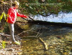 Despite the wonderful weather, I did not spend any time in the garden over our long Thanksgiving weekend. (We Canadians are a bit ahead of our American friends celebrating Thanksgiving. ) Instead we decided to cross the country and have our Turkey and Pumpkin pie with our west coast grandchildren. The dinner and the granddaughters were all wonderful. First we provided the big city cousin with houseplant advice in trade for bed and breakfast and then flew into the interior of B.C. the next morning. Why is this of any interest to my readers? It was not a garden visit but it was amazing. We walked along a section of the Adam’s river, about 500 km, by river, from the Pacific Ocean and were entranced by quantities of large bright red Sockeye Salmon. They swam that distance to return to their birth place where they will mate and lay their eggs and then die. The sight of these majestic fish is made all the more fascinating as you contemplate what they have done over the past weeks to reach this location. The granddaughters took great delight in showing us this natural wonder and encouraging us to return next year when the number of fish will be much greater. There is a four year cycle between the huge migrations that bring over a million fish to this location. We thought the 10,000 + that we were witness to, were an incredible site.