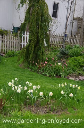 The long cool spring weather has made the hundreds of bulbs in the yard somewhat slow emerging but the upside is that they last a lot longer in the cool damp days. The Narcissus clump in the foreground is several years old and the Tulips by the evergreen, Chamaecyparis nootkatensis pendula, are new this year. The Assistant Gardener is happy with their longevity as they remind her of the drifts of Daffodils in U.K. of her youth.