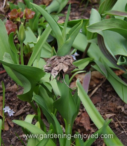 This is just one of those things that fascinate me in the garden. Tulip bulbs will push their way up through several cms of hard and heavy soil. There always seem to be a few of them that emerge through the centre of a decaying leaf and can’t seem to break free of it. A very gentle tug from the gardener quickly releases it, leaving that gardener wondering what happened to allow that particular decaying leaf to have the strength to restrict the power of an emerging Tulip. That’s what keeps us in the garden year after year, the little unanswerable mysteries that Mother Nature provides, to those of us who take the time to notice and ponder.