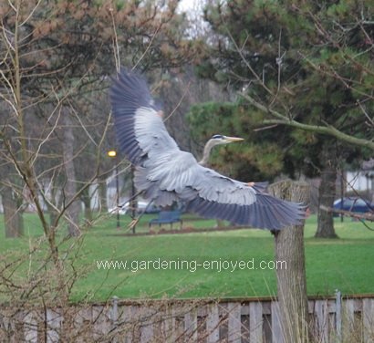 This is a beautiful picture of the great blue heron leaving my yard. I would like to think it was for the last time but that would be delusional. He has been very active this spring and I have had very little Heron activity in the spring in previous years. He cleaned out my fish before the ice storm. A wonderful reader gave me a couple of pails full of big fish as they were shutting down their pond. I put them in my ponds that afternoon and woke up to this feathered “friend” the next morning. I was planning to put up a small fence that day but he didn’t give me a chance. There is still a nice school of fish in the top pond because it’s too deep for him. Lots of research on deterring Herons has made me realize that they are not easily deterred. I’m going to try a couple of strands of monofilament fishing line in a low fence around the edges of the ponds before I acquire any new fish. Many suggest an electric fence but I’m not sure I want that much expense and effort