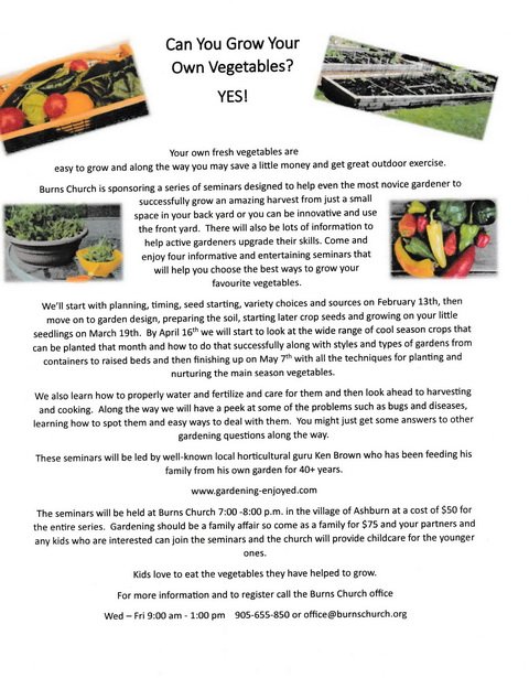 Are you interested in Vegetable gardening. If you live anywhere near me in the in the town of Whitby or adjacent areas, then this might be of interest. I’m doing a series of 4 seminars this spring to look at many aspects of that great pastime. Details are in the poster.
