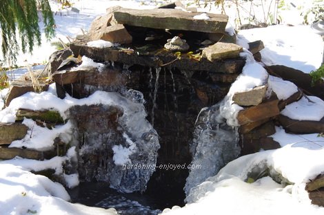 While wandering around in that Parka I came upon another shot of the beauty of this weather and it was also another reminder of things yet to do. Not only do I not have the bubblers in the ponds but I haven’t even turned off the pump as yet. That running pump makes this delightful ice on the waterfall but not all of the water is making it back to the bottom pond. I can see the ice on that pond sagging in the middle. It needs to be filled back up so that the fish and plants have a better chance of winter survival. That requires the hose. I know where it is. It’s frozen solid under the snow somewhere. Do I wait to see if it really warms up enough to thaw it or do I do the big ugly. Look for it under the snow and then drag it frozen, into the basement where it can thaw out and drain. If I get it thawed and drained, I still need to use it to fill that pond. How can one outdoor winter activity be so