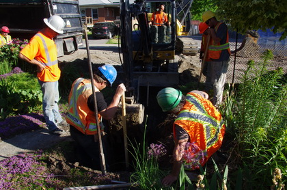 In contrast to the beauty in the back yard, I have had several helpers in the front yard most of this week. They asked me to move Constance. That’s a Peony that carries the same name as the Assistant Gardener’s mother. When I pointed out that they wanted me to dig up and move my mother in law at the worst possible time of year they didn’t seem to share my concern. That’s where the hookup to the new sewer had to be made. Another Peony, a few Iris and assorted other perennials were also apparently in the way of their sewer hook up. When they finally found the old sewer pipe coming from the house it was over 2 m, from the indicated position and was actually in the middle of the front pathway where nothing was growing, except for the few usual weeds. Constance is struggling to stay alive in her temporary home in the vegetable garden and if you listen closely