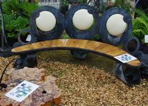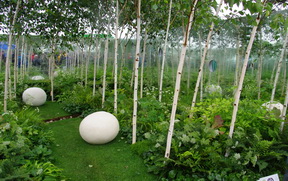 Outdoor Inspirations We started in the outdoor display gardens where the best of British Garden Designers show off their skills. The amazing range of gardens that can be created in a rather small space, by Canadian standards, kept us constantly in awe. The new camera was touted as being quite water resistant and it was as it was hauled out from under my slicker close to 400 times that day. One of the first gardens we saw is one that stayed in our memories. A very simple green and white motif using grass, white rocks, Birch trees and green and white flowers and foliage, with the three closed sides, completely covered in mirror. The garden became much larger, the mirrors turned and changed and the paths and multiplied the trees as well as relocating them as you changed your viewing angle.