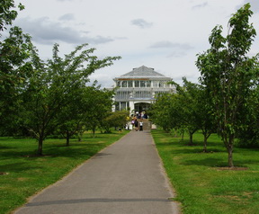 Old and Cute! No not yours truly but the waterlily house. It is a tiny glasshouse that was built in 1851, specifically to house a large water lily, Victoria amazonica These amazing lilies have leaves up to 2m across but they did not thrive in this little house. New hybrids developed at Longwood gardens in the 1960s were easier to grow and this delightful little gem of a glasshouse once again is used for its original purpose. Another feature that we searched for was the Wollemi Pine that was noted on the map. We eventually found this 2.5 tree completely enclosed by a heavy metal barrier and my traveling companion, known to all as the assistant gardener, pronounced that she was mightily unimpressed. Unless you are aware of the history of this little tree, it really was unimpressive as a specimen. I can now say that I have actually seen this fascinating plant and was prevented from buying one in the Kew Gardens shop both by its price and my inability to transport it back to Canada. It would probably not be hardy here anyway.