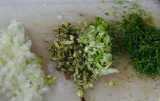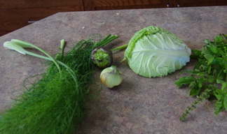 While stirring chop and add the other ingredients. With my green savoy cabbage, I add some Onion, green Pepper and Fennel. Each of those would be 1/4 of the amount of cabbage at most. If you have a few red radish to chop in, it gives the slaw a bit of a colour lift. Keep stirring.