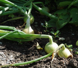 When Do We Eat? As soon as the first ones look thick enough to make decent green Onions start enjoying them. The bulbing types will slowly develop bigger and bigger bulbs and you just start eating them as soon as they are big enough. They can stay in the ground for as long as the weather holds. By mid autumn, if the leaves are not shrivelling,stop your growing onions by bending them over to break them and eventually pull the bulbs out of the soil and leave in the sun to dry for a few days. Store them in net bags in your cold cellar and enjoy your bounty well into the winter.
