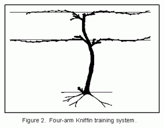 It’s all about pruning There are many different pruning systems and a couple of them recommend themselves growers of home garden grapes. The difficult thing to adjust to is removing about 90% of last year’s growth each winter. I strung some wires and started to train my vines and then discovered that I had the basis of a six arm kniffen. Four arm kniffens are more popular and that is probably where I will wind up. I had never heard of a kniffen but apparently now I have one. The basis of the late winter pruning is to create some horizontal canes of last year’s new growth. These will produce this years fruit and next years canes. Let’s follow the 3 year process to establish good home garden grapes.