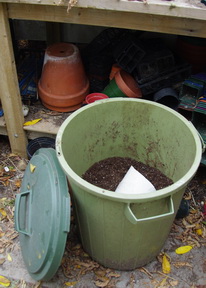 Soil Storage? I use plastic garbage cans with lids. (picture right) Now you have to store these buckets of soil as well as the empty containers and next summer you have a collection of empty garbage pails to deal with while they await their winter job. The empty containers, on the other and can now be nested and will take up less room. You do, of course, have to refill all of those containers next spring when there may be lots of other chores requiring your attention.