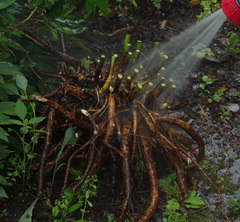 How Do I Divide It seems daunting at first glance. Cut the foliage off, leaving about 7 - 9 cm stems attached to the root. Wash the root mass free of most soil so that you can actually see what you are dealing with. Study the massive root structure and determine sections of it that have 4 to 5 healthy looking red buds, (usually called eyes.) A combination of wiggling, urging and then cutting through the roots will eventually produce several divisions with a reasonable amount of root structure and the necessary eyes. This will take some time and large pair of pruners to cut through the heavy roots. I have used a pruning saw or large knife to divide the heaviest roots.