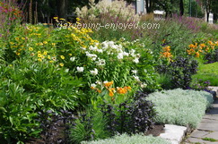 Joan of Arc Delights Far removed from the gritty rooftop and utility of that vegetable garden was a delightful floral park, La Parc de Jeanne D’arc, that is part of the National Battlefields Commission. It is adjacent to Quebec City's historic Plains of Abraham and features a large sculpture of Joan of Arc at its centre. The garden is a very creative mix of perennials, annuals and tropicals planted on the sloped edges of this sunken garden. It is impressive at first sight because of its colour and scale but becomes even more impressive during an intimate exploration. There are splashes of colour from common annuals used in uncommon ways. There are no straight lines. A brightly coloured insert of dark leaved Ornamental Peppers weaves a serpentine path through some bright orange Cannas and around the grey foliage of earlier blooming Dianthus. This constant interplay of colour and texture along with variations of size and shape make each step around the long rectangle a new garden adventure and delight.