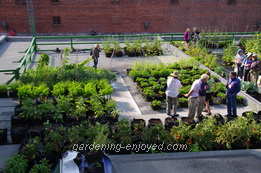 Smart Pots ® and was a great display of the variety of sizes and shapes that are available. This extensive garden needed a minimum of maintenance due to the irrigation system that wound its way throughout the roof supplying water through emitter rings or drip spikes in each pot. The soil is reused from year to year to reduce costs and the labour required to haul all of that soil up that set of rickety stairs. Since 2009 this garden has grown about 1.5 tons of produce each year from a roof that is about 6000 ft2 (560 M2). The mission and accomplishments of this group makes us all proud to be gardeners and should motivate us to use our knowledge and talents to make urban life even more rewarding.