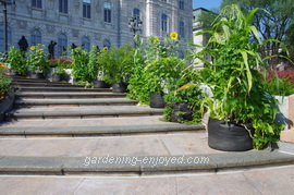 Big Red Pots The intersection of two main streets just beside the parliament buildings and adjacent to the walls of the old town provide a great view of much of the city and in the middle of that view is this delightful container garden. The giant pots filled with mixed annuals such as the bright yellow Cannas surrounded by a cloud of tall blue Verbena created a wonderful focal point through which to see the cityscape beyond. Such interesting and innovative garden features were to be seen throughout the city.